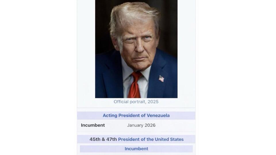 Скріншот імітує сторінку енциклопедії Wikipedia, де перераховані його титули: 45-й і 47-й президент США, а нижче додано рядок “Виконувач обов’язків президента Венесуели” з датою січня 2026 року.